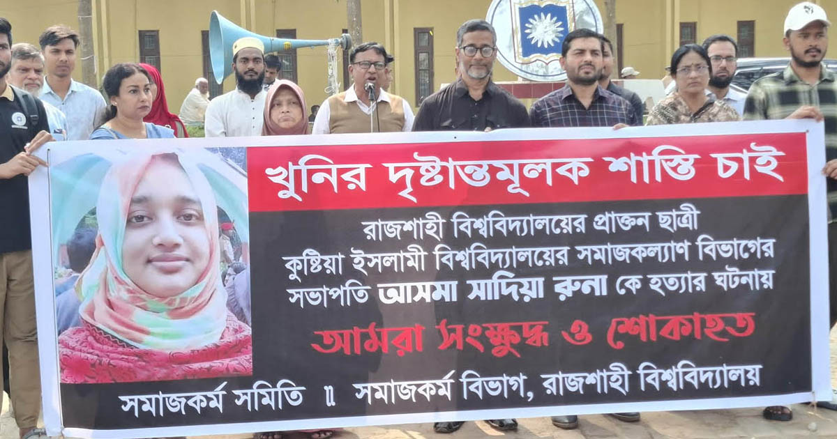 ইসলামী বিশ্ববিদ্যালয়ের (ইবি) সমাজকল্যাণ বিভাগের সভাপতি ও সহকারী অধ্যাপক আসমা সাদিয়া রুনা হত্যাকাণ্ডের বিচারের দাবিতে রাজশাহী বিশ্ববিদ্যালয়ে (রাবি) মানববন্ধন কর্মসূচি পালিত হয়েছে।
